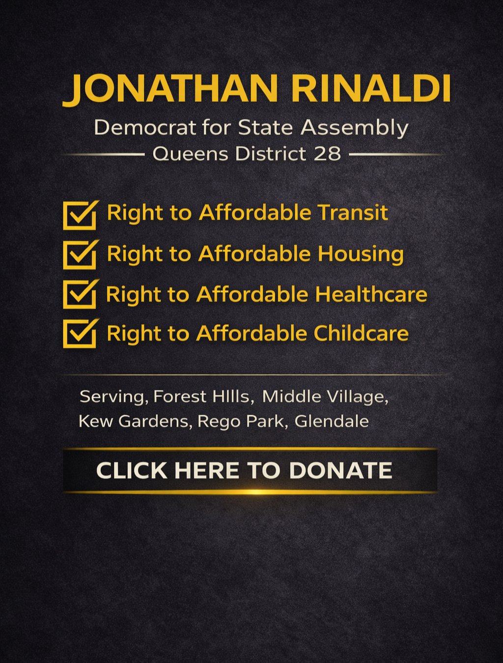 JONATHAN RINALDI is running for New York State Assembly in Queens District 28 to serve residents, protect the right to affordable living, and deliver real improvements to infrastructure, transit, and energy systems that shape everyday life.
